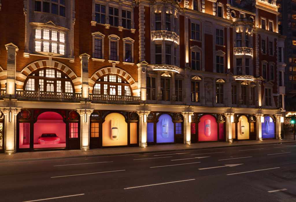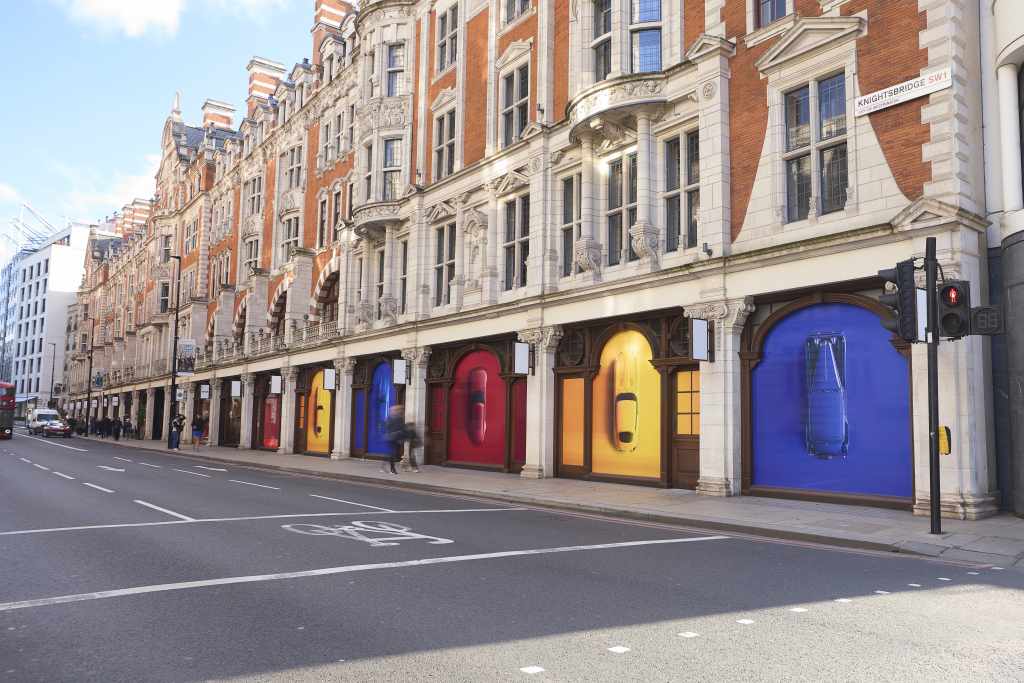 Jaguar icons will dominate the Knightsbridge store front. The striking art display features four Jaguar originals: the SS 1, XJS, E‑type and Type 00 design vision concept.