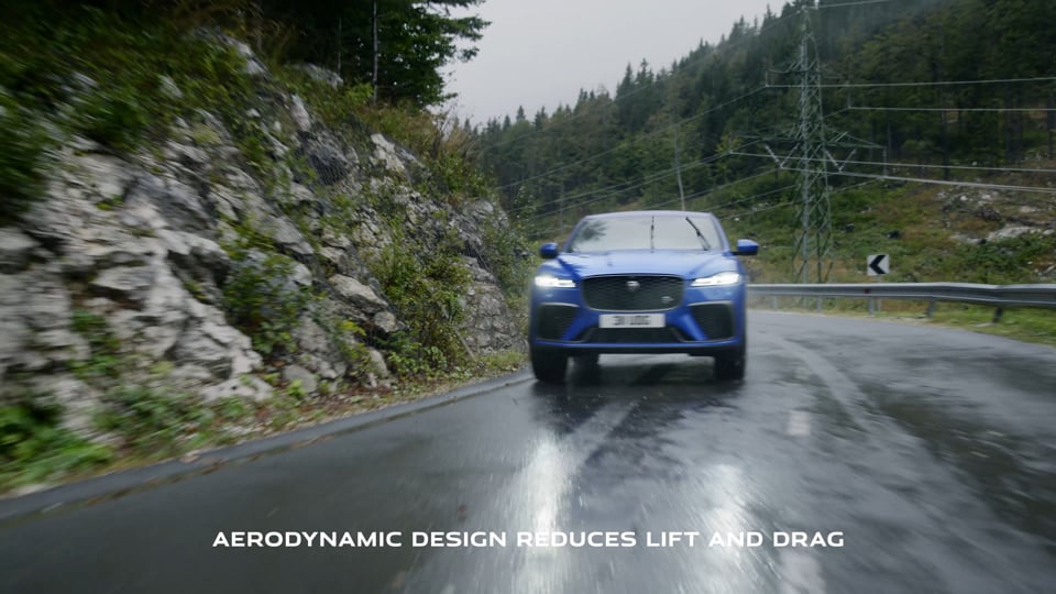 L’esthétique de la nouvelle F‑PACE SVR est inspirée par l’expérience en compétition du département SV, le contrôle des flux aérodynamiques à travers de nouvelles ouïes et prises d’air améliorant le refroidissement du moteur ainsi que des freins. Les modifications résultent en une performance aérodynamique bien meilleure, ce qui se traduit par 35 % de portance en moins. Le coefficient de pénétration dans l’air (Cx) gagne aussi un point, de 0,37 à 0,36. En plus d’améliorer les performances, ces changements construisent une esthétique plus technique.
