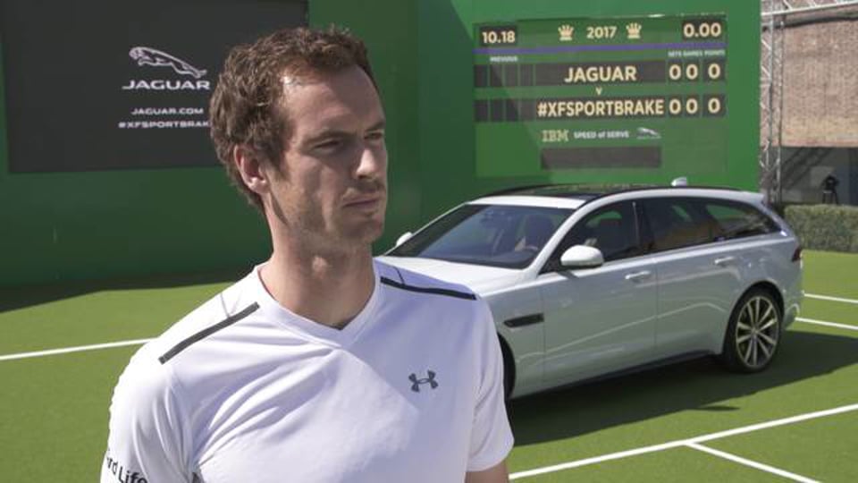 Two‑time Wimbledon champion Andy Murray pulled the covers off the new Jaguar XF Sportbrake on a replica Centre Court in London